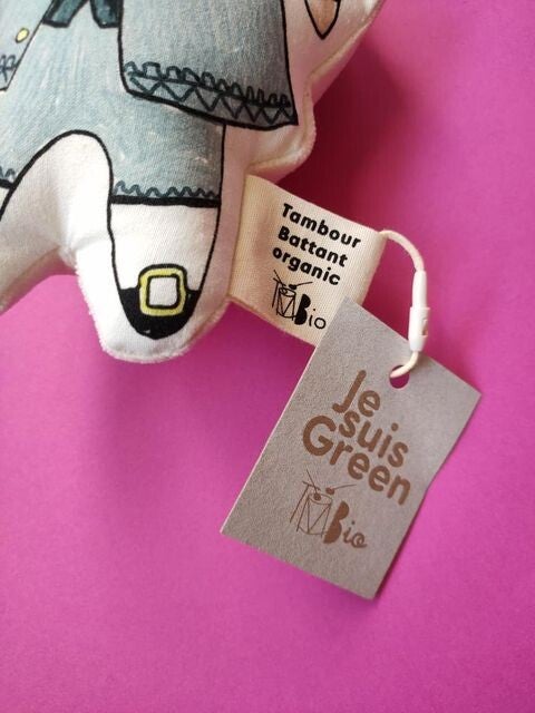 Le dessin est imprimé sur du coton bio avec des encres bio, le tout est certifié GOTS, les encres sont donc sans agents toxiques et sont adaptées à l'usage des bébés.