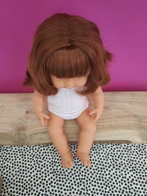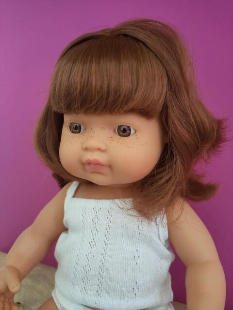 Poupée, à la peau blanche et aux yeux noisettes. Elle mesure 38 cm.