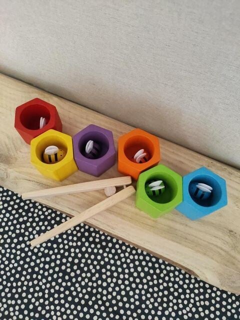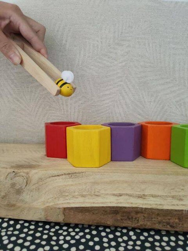 La pince pour déplacer les abeilles est un travail de pré-écriture car cela permet de muscler la main. Permet également d’affiner le geste, et de le rendre plus précis.