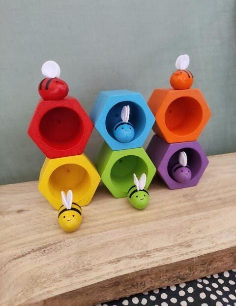 Les enfants peuvent ranger les abeilles selon les couleurs, ou bien selon un algorithme défini, peuvent également empiler les alvéoles, enrichir leur vocabulaire.