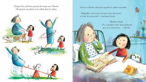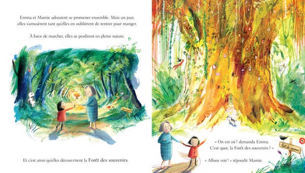 Résumé : Connais-tu la Forêt des souvenirs ? C’est un lieu magique, à l’abri des regards, où est préservé tout ce que nous avons oublié : leçons, chemins, odeurs et surtout souvenirs. Lorsqu’Emma et sa mamie découvrent cet endroit unique, grand-mère et petite fille embarquent pour un merveilleux voyage dans le monde des souvenirs oubliés de Mamie. Et découvrent qu’il y a une chose dont elles doivent absolument se souvenir, c’est l’amour inconditionnel qu’elles se portent.