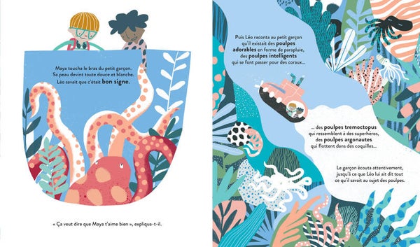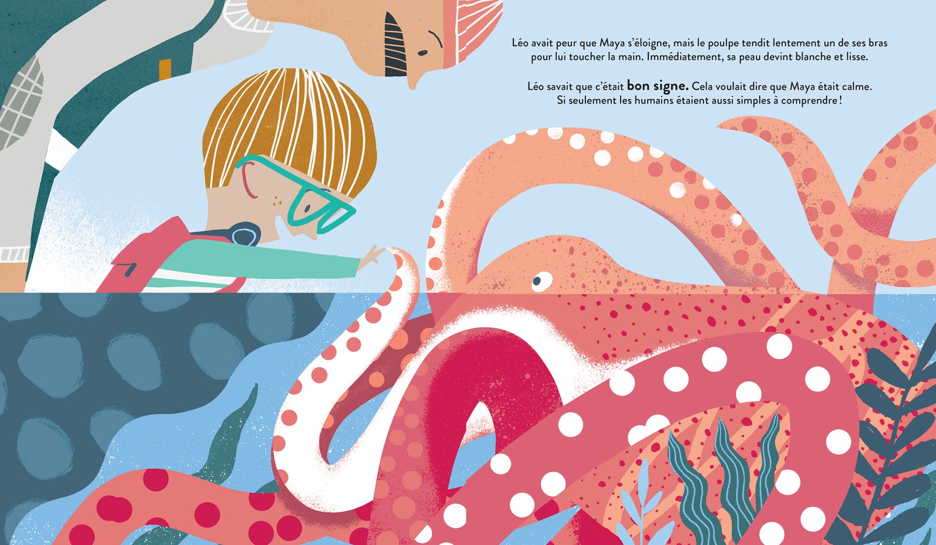 Résumé : Le monde est trop bruyant et trop lumineux pour Léo, qui se sent mieux seul qu’avec les autres enfants de sa classe. Mais un jour, il fait la connaissance d’un poulpe appelé Maya. La communication est facile avec lui car le poulpe change de couleur selon son humeur. L’enfant et le poulpe créent au fil du temps une connexion très spéciale et Léo ne se sent plus aussi seul. Il finit même par faire découvrir Maya à un autre petit garçon et à se lier d’amitié avec lui.